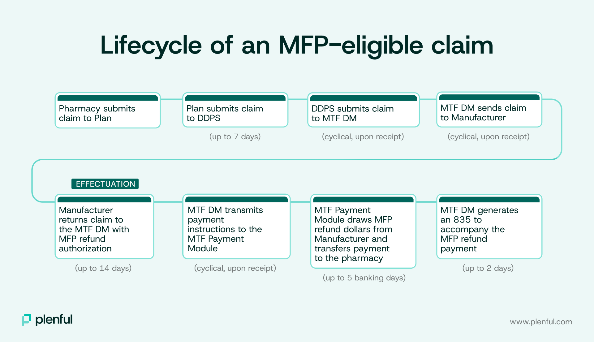 Under MFP, pharmacies dispense and adjudicate Part D prescription claims as they do today. Reimbursement from Part D plan sponsors for the select MFP drugs is now limited to the Maximum Fair Price (MFP) plus a dispensing fee. Plans submit prescription claim information to CMS’s Drug Data Processing System (DDPS), which then passes specific data elements along to the Medicare Transaction Facilitator (MTF) Data Module (DM). Manufacturers utilize the claims data from the MTF DM to determine which claims are eligible for an MFP refund and the appropriate amount, a process called “Effectuation”. Manufacturers have 14 days to effectuate the refund and return the corresponding data to the MTF DM.