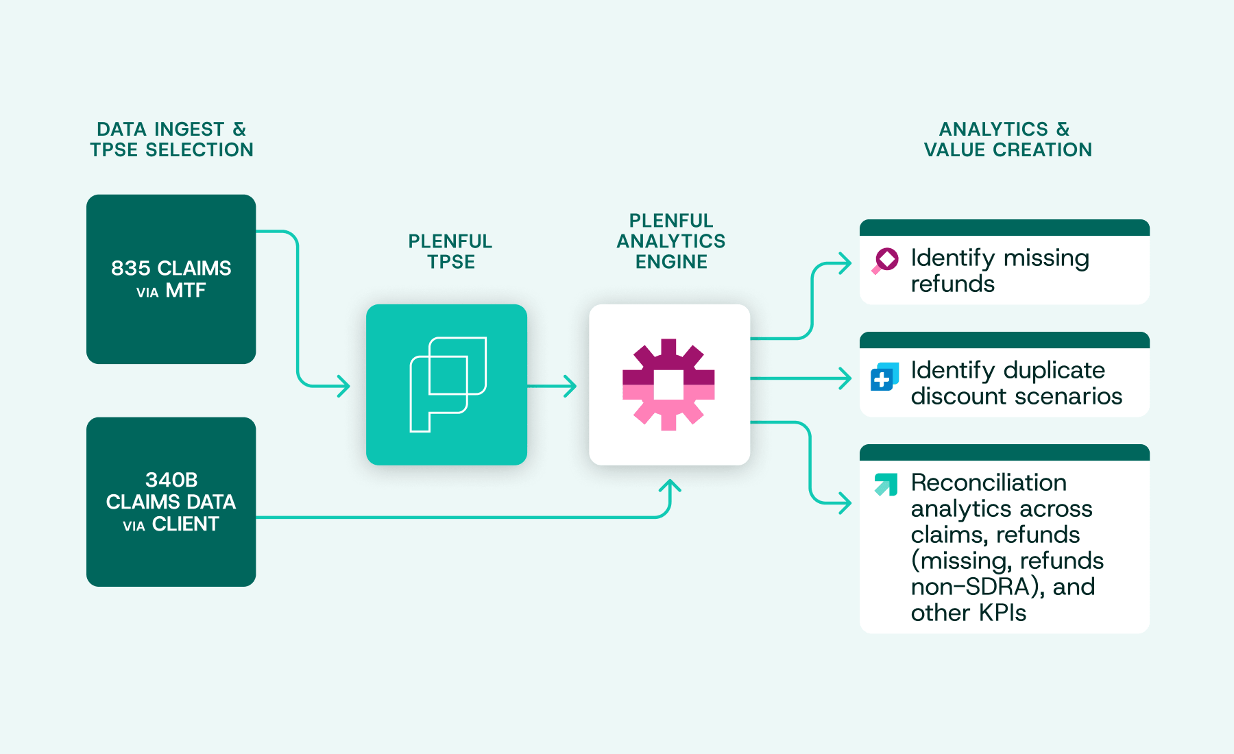 Plenful sources 835 remittance data from the MTF as a designated Third-party Support Entity (TPSE), and separately ingests claim-level information (including 340B status) via pharmacy management systems and TPAs. Plenful's platform runs an automated reconciliation analysis across datasets to identify missing refunds or duplication scenarios.